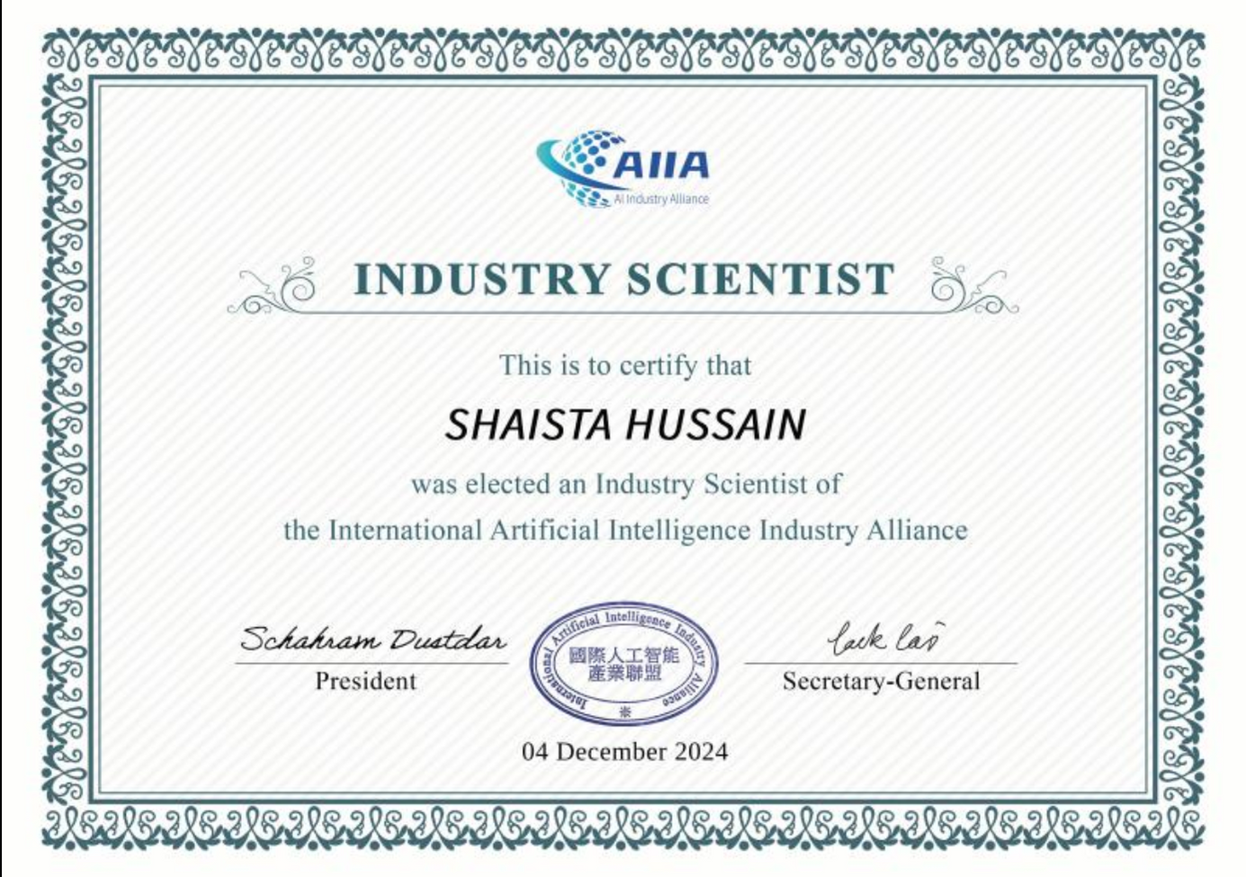 An accomplished Machine Learning Engineer, Cybersecurity Specialist, Clinical Pathologist, and researcher, Dr. Hussain has developed advanced algorithms and ethical AI models, and has contributed extensively to fields including data analysis, blockchain, and CRISPR-Cas9 genomics. She is a published scientist and international speaker, recognised for thought leadership in explainable, responsible, and secure AI systems.